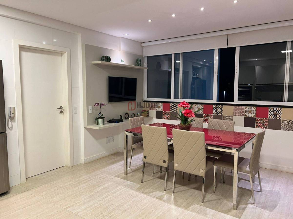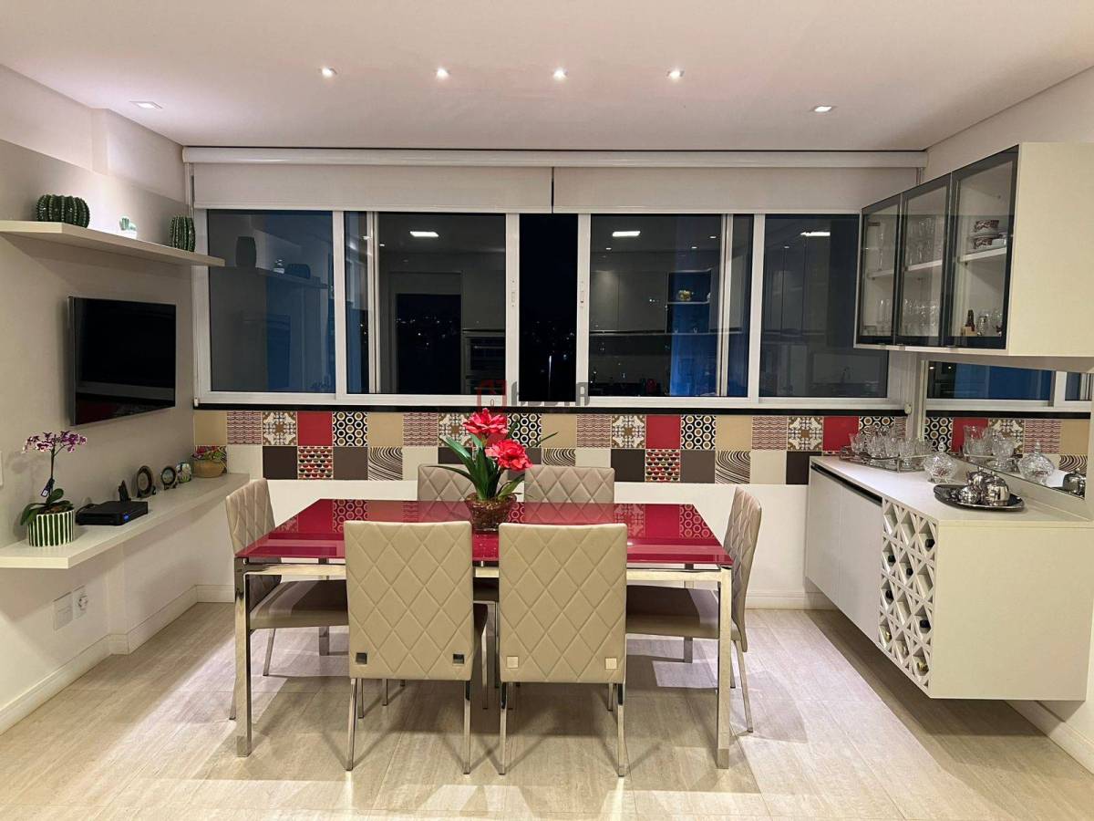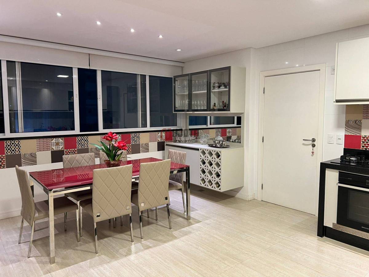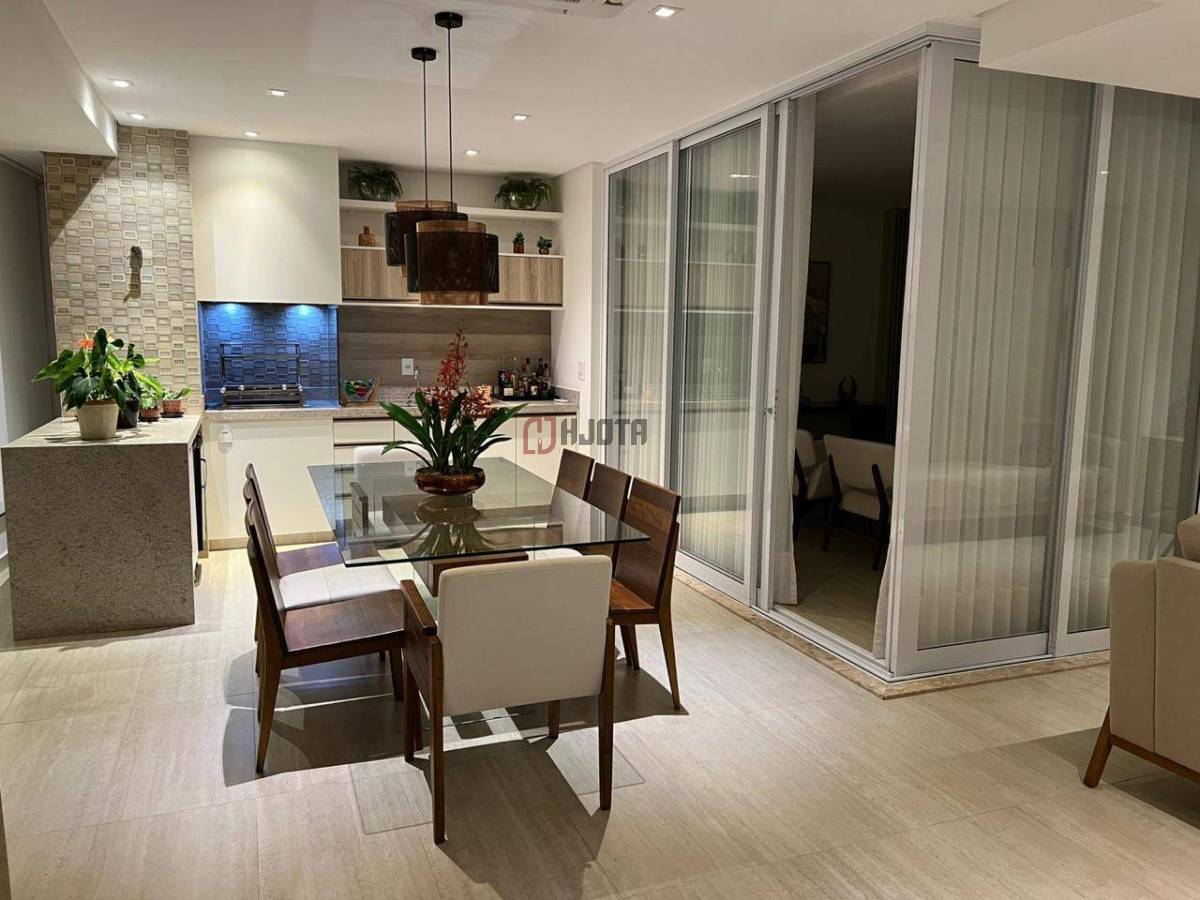 • Sala de jantar integrada à varanda gourmet climatizada, com churrasqueira a carvão